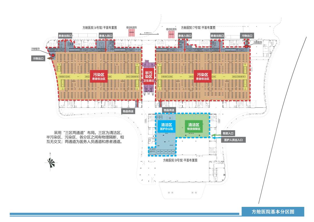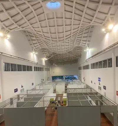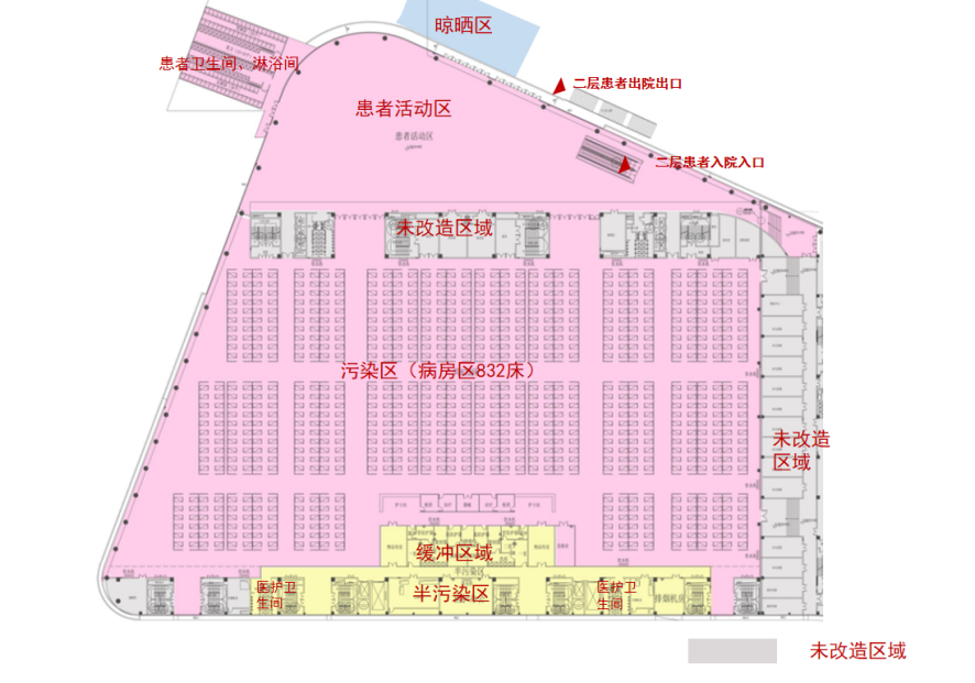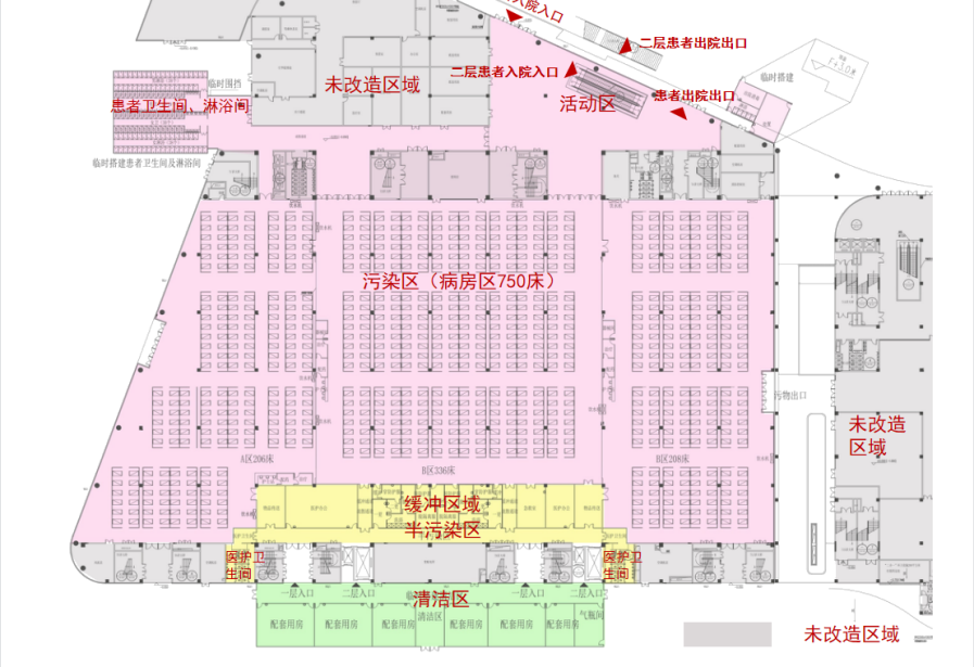 改造面积约2.18万平方米,床位数1582床。病房区域设置多个方舱,方舱之间主要通道4米,周围设置2.4米高医疗抗菌洁净版隔断,中间设置1.2米矮隔断。各个舱室划分应均匀有序,床位排布满足横向不小于1.0米的间距和纵向不小于1.4米间距。每个方舱按人数40人、32人、24人不等设置。