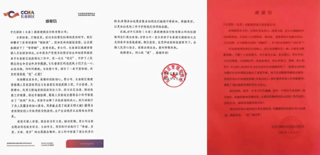 众志成城,战胜疫情。近期,中元长春陆续收到长春新区管委会和北湖科技开发区疫情防控领导小组办公室的感谢信和锦旗,以此来感谢中元长春在本轮疫情防控工作中给予长春新区的帮助与支持。